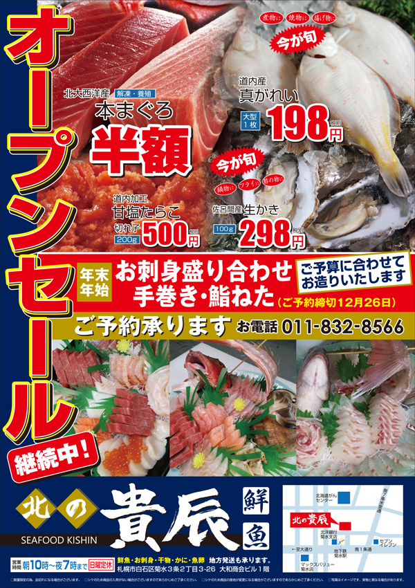当社では、ダクト工事業以外にも、地域に根ざした鮮魚店「北の貴辰」を運営しております。 新鮮な魚介類を取り揃えており、地域の皆さまにご愛顧いただいております。ぜひお気軽にお立ち寄りください。